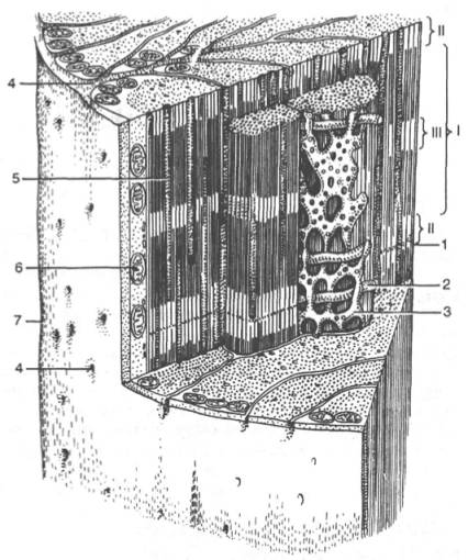 I - А-диск; II - I-диск; III - Н-зона; 1 - Z-линия; 2 - Т-система; 3 - саркоплазматическая сеть; 4 - устье Т-системы; 5 - гликоген; 6 - митохондрия; 7 - сарколемма.