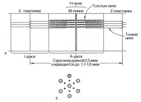 При исследовании тонких срезов мышц под электронным микроскопом было обнаружено, что белковые нити расположены строго упорядоченно. Толстые нити диаметром 12–16 нм и длиной примерно 1,5 мкм уложены в форме шестиугольника диаметром 40–50 нм и проходят через весь диск А. Между этими толстыми нитями расположены тонкие нити диаметром 8 нм, простираясь от Z-линии на расстояние около 1 мкм. Изучение мышцы в состоянии сокращения показало, что диски I в ней почти исчезают, а область перекрывания толстых и тонких нитей увеличивается (в скелетной мышце в состоянии сокращения саркомер укорачивается до 1,7–1,8 мкм).