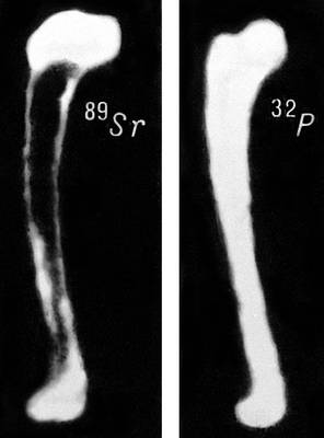 Рис. 1. Отложение радиоактивных изотопов стронция и фосфора в костях: 89Sr откладывается преимущественно в самой кости, 32P — в костном мозге.
