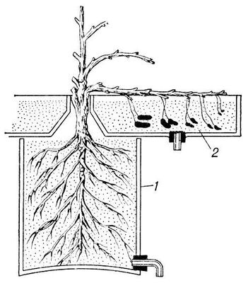 Рис. 4. Схема опыта по изучению поглощения радиоактивных изотопов раздельно корнями и плодами арахиса: 1 — среда для корней; 2 — среда для плодов.