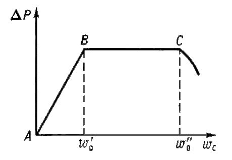 Переход неподвижного слоя в кипящий происходит при такой скорости ожижающего агента, когда гидродинамическое давление потока Р уравновешивает силу тяжести G, действующую на частицы. При дальнейшем увеличении скорости слой вначале расширяется при неизменном гидравлическом сопротивлении, а при достижении условия P>G частицы начинают выноситься из слоя. На приведена диаграмма, характеризующая зависимость перепада давления в слое DР от скорости движения сжижающего агента w0. Пока слой неподвижен, Р возрастает при увеличении w0 (участок АВ). После точки В, соответствующей переходу слоя в кипящее состояние, сопротивление слоя не изменяется при росте скорости (участок ВС). После точки С, соответствующей началу уноса частиц твердого материала, сопротивление слоя падает. Скорости ожижающего агента, соответствующие точкам В и С, называются скоростью псевдоожижения (w'0) и скоростью уноса (w»0). Отношение W= w''0/ w'0 называется числом псевдоожижения. Оно характеризует интенсивность перемешивания частиц в кипящем слое. Наиболее интенсивному перемешиванию соответствует W=2, при дальнейшем росте W слой становится неоднородным: происходит прорыв крупных пузырей газа через него и начинается интенсивное выбрасывание частиц в пространство над его поверхностью. Возможно также образование газовых пробок. Кипящий слой характеризуется постоянством температуры по высоте и сечению, даже если в нём протекают процессы с большим тепловым эффектом, а также высокими значениями коэффициента теплопередачи к поверхностям теплообмена.
