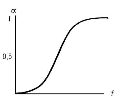 Продукт реакции — уксусная кислота CH3COOH и ион Н+, образующийся при её электролитической диссоциации, ускоряют реакцию. Скорость автокаталитической реакции вначале возрастает вследствие увеличения количества продукта, являющегося катализатором, а затем падает в результате израсходования исходных веществ. Поэтому зависимость степени превращения a от времени t описывается S-образной кривой (см. рис.). Реакция начинается благодаря присутствию в начальный момент некоторого малого количества продукта (затравка) или другого катализатора, или, наконец, за счёт медленной некаталитической реакции, происходящей параллельно каталитической. Если начальная концентрация катализатора и скорость некаталитической реакции весьма малы, то в течение некоторого времени, называемого периодом индукции, реакция настолько медленна, что практически не обнаруживается, и лишь по истечении этого времени становится заметной.