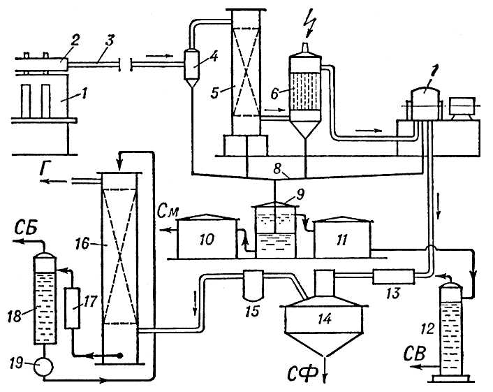 Схема улавливания продуктов коксования: 1 — коксовая батарея; 2 — газосборник; 3 — газопровод; 4 — отделитель конденсата; 5 — газовый холодильник; 6 — электрофильтр (для отделения смолы); 7 — газодувка; 8 — трубопровод для отвода конденсата; 9 — отстойник; 10 — хранилище смолы; 11 — хранилище аммиачной воды; 12 — аммиачная колонна; 13 — подогреватель газа; 14 — сатуратор; 15 — каплеотбойник; 16 — бензольный скруббер; 17 — подогреватель насыщенного масла; 18 — бензольная колонна; 19 — холодильник для масла; СБ — сырой бензол; Г- обратный газ; См -смола; СФ — сульфат; СВ — сточные воды.