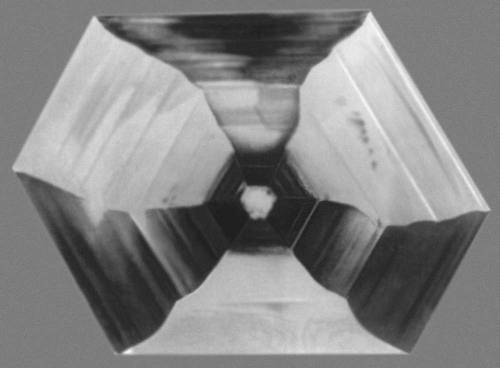 Рост кристаллов. Из слабо переохлажденных паров, растворов и реже расплавов кристаллы растут в форме многогранников. Их наиболее развитые грани обычно имеют простые кристаллографические индексы (см. Миллеровские индексы), например для алмаза это грани куба и октаэдра. Взаимная ориентация граней, как правило, такова, что размер каждой из них тем больше, чем меньше её скорость роста. Т. к. скорость роста увеличивается с переохлаждением по-разному для разных граней, то с изменением переохлаждения меняется и облик (габитус) кристалла. Рост простых кристаллографических граней идёт послойно, так что края незавершённых слоев — ступени — движутся при росте вдоль грани. Высота ступени, т. е. толщина откладывающегося слоя, колеблется от долей мм до нескольких Ǻ. На тонких двупреломляющих кристаллических пластинках ступени наблюдаются в поляризованном свете как границы областей различной окраски (рис. 3). Тонкие ступени наблюдают методом декорирования, а высокие ступени — непосредственно, с помощью оптического или электронного микроскопов. Тонкие ступени движутся при росте быстрее толстых, догоняют их и сливаются с ними. В свою очередь, высокие ступени расщепляются на более низкие. Формирующаяся т. о. ступенчатая структура поверхности сильно зависит от условий роста (температуры, пересыщения, состава среды) и влияет на совершенство формы кристалла. Например, появление на кристаллах сахарозы высоких ступеней ведёт к захвату капелек маточного раствора и растрескиванию кристаллов.