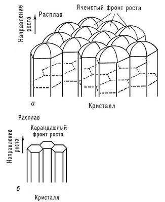 Если расплав перед фронтом роста переохлажден, то выступ, случайно возникший на поверхности, попадает в область большего переохлаждения, скорость роста его вершины увеличивается ещё больше и т. д. В результате плоский фронт роста разбивается на округлые купола, имеющие в плоскости фронта форму полос или шестиугольников,— возникает ячеистая структура (рис. 9, а). Линии сопряжения ячеек (канавки) оставляют в теле растущего кристалла дефектные и обогащенные примесью слои, так что весь кристалл оказывается как бы сложенным из гексагональных палочек или пластинок (карандашная структура; рис. 9, б).