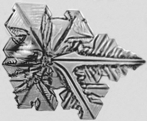 Если в переохлажденном расплаве (растворе) оказывается не плоская поверхность, а маленький кристалл, то выступы на нём развиваются в различных кристаллографических направлениях, отвечающих максимальной скорости роста, и образуют многолучевую звезду. Затем на этих главных отростках появляются боковые ветви, на них — ветви следующего порядка, — возникает дендритная форма кристаллов (рис. 10). Несмотря на причудливую древовидную форму, кристаллографическая ориентация дендритного кристалла одинакова для всех его ветвей. Необходимые условия для развития дендритов у кристаллов, растущих послойно, — большое переохлаждение и плохое перемешивание.