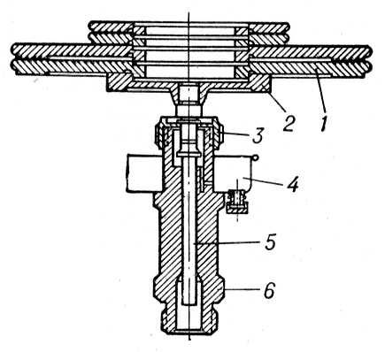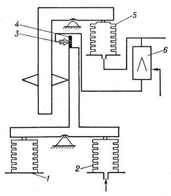 Рис. 6. Принципиальная схема бесшкального манометра абсолютного давления типа МАС-П1: 1 — сравнительный сильфон; 2 — измерительный сильфон; 3 — сопло; 4 — заслонка; 5 — сильфон обратной связи; 6 — пневмоусилитель.