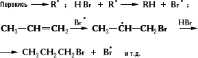 Марковникова правила нарушается также в реакциях присоединения HBr к олефинам в присутствии перекисей (эффект Караша), так как механизм реакции в этом случае радикальный. Атакующей частицей является атомарный бром, а ориентация присоединения определяется стабильностью промежуточно образующегося углеродного свободного радикала: