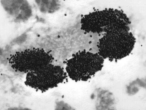 Рис. 3. Включение в ядра соединительнотканых клеток меченного тритием тимидина, идущего на построение нуклеиновых кислот. Увеличено в 600 раз.