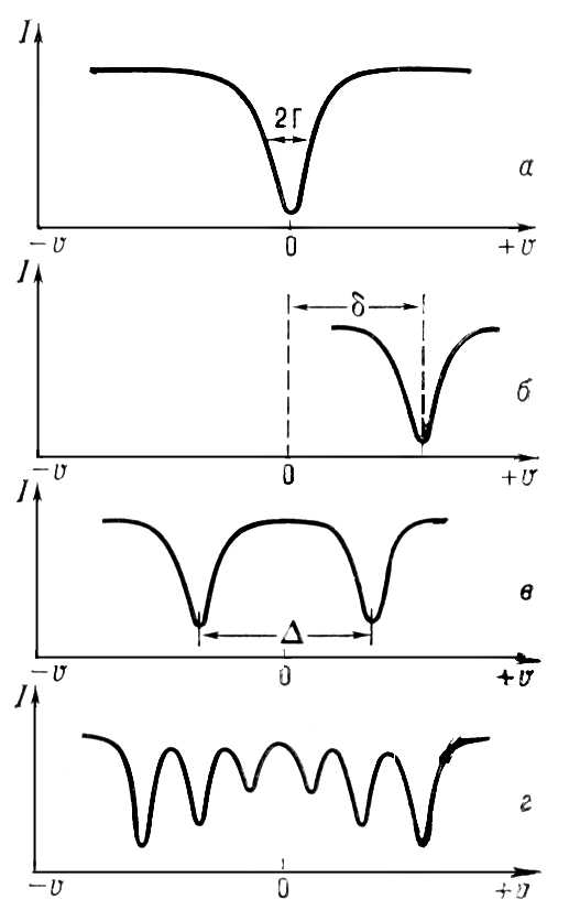 На рис. 4, а показан спектр поглощения, состоящий из одной линии: линии испускания и поглощения не смещены друг относительно друга, т. е. находятся в точном резонансе при v = 0. Форма наблюдаемой линии может быть с достаточной точностью описана лоренцовой кривой (или Брейта — Вигнера формулой) с шириной на половине высоты 2G. Такой спектр наблюдается только в том случае, когда вещества источника и поглотителя химически тождественны и когда на ядра атомов в этих веществах не действуют ни магнитное, ни неоднородное электрическое поля. В большинстве же случаев в спектрах наблюдаются несколько линий (сверхтонкая структура), обусловленных взаимодействием атомных ядер с внеядерными электрическими и магнитными полями. Характеристики сверхтонкой структуры зависят как от свойств ядер в основном и возбуждённом состояниях, так и от особенностей структуры твёрдых тел, в состав которых входят излучающие и поглощающие ядра.
