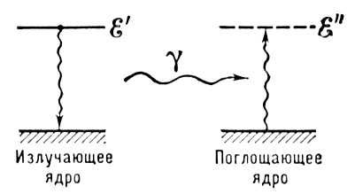При облучении вещества g-квантами наряду с обычными процессами взаимодействия (см. Гамма-излучение) возможно резонансное поглощение g-квантов ядрами, при котором g-квант исчезает, а ядро возбуждается, т. е. переходит в состояние с большей внутренней энергией. Это явление аналогично резонансному поглощению световых квантов (фотонов) атомами (см. Атом, Квантовая электроника). Необходимое условие резонансного поглощения состоит в том, чтобы энергия, которую квант расходует на возбуждение ядра, равнялась бы в точности энергии квантового перехода, т. е. разности внутренних энергий ядра в возбуждённом и основном состояниях. На первый взгляд это условие автоматически удовлетворяется, когда излучающие и поглощающие ядра одинаковы (рис. 1). Однако g-квант с энергией E обладает импульсом p = E/с (где с — скорость света, см. Корпускулярно-волновой дуализм), и по закону сохранения импульса при излучении или поглощении кванта ядром последнее испытывает отдачу. Излучающее ядро массы М, получив импульс приобретает кинетическую энергию DE = р2/2М = E2/2Мс2. Т. о., часть энергии g-перехода трансформируется в кинетическую энергию ядра и энергия испущенного кванта меньше полной энергии g-перехода на величину DE. Такая же энергия DE передаётся свободному (покоящемуся) ядру и в процессе поглощения. Поэтому для достижения резонанса падающий на ядро g-квант должен иметь энергию на величину DE большую, чем энергия перехода. В результате линии испускания и поглощения оказываются смещенными друг относительно друга на величину 2DE = E2/Мс2 (рис. 2).