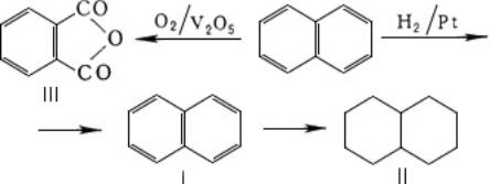 Гидрирование нафталина даёт тетралин (1) и декалин (II), окисление — фталевый ангидрид (III), например: