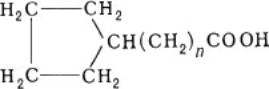 Нафтеновые кислоты, карбоновые кислоты (большей частью одноосновные) алициклического ряда, содержащие один или несколько пятичленных (реже шестичленных) углеродных циклов, например: