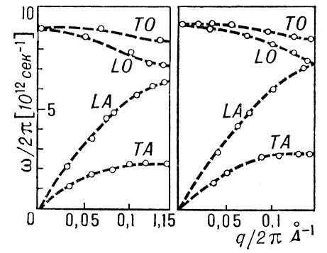 Нейтронная спектроскопия. Близкие значения энергии тепловых нейтронов и энергии тепловых колебаний атомов в кристаллах позволяют измерять последнюю в экспериментах по неупругому рассеянию нейтронов с высокой точностью. В этом случае часть энергии нейтрона при взаимодействии передаётся молекуле или кристаллу, возбуждая колебания того или иного типа; возможен и обратный процесс передачи энергии от кристалла нейтрону. Различают неупругое когерентное и некогерентное рассеяния нейтронов. Когерентное неупругое рассеяние медленных нейтронов определяется динамикой всех частиц кристалла и может рассматриваться как столкновение нейтрона с коллективными тепловыми колебаниями решётки — фононами, при котором энергия и импульс (точнее, квазиимпульс) сталкивающихся частиц сохраняются. Эксперименты по неупругому когерентному рассеянию нейтронов на монокристаллах исследуемого соединения дают поэтому полную информацию о фононах в кристалле — фононные дисперсионные кривые, что недоступно др. методам исследований. На рис. 4 приведены дисперсионные кривые фононов (акустические и оптические ветви; см. Колебания кристаллической решётки) в кристалле германия для двух кристаллографических направлений. Совпадение экспериментальных результатов с расчётами, сделанными на основе определённой теоретической модели, говорит о справедливости модели, а также позволяет вычислить ряд параметров силового межатомного взаимодействия.