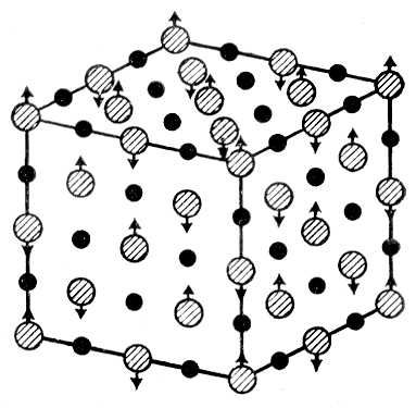 Рис. 5. Магнитная структура антиферромагнетика MnO. Заштрихованные кружки — ионы марганца, чёрные — ионы кислорода; стрелки указывают направления магнитных моментов.