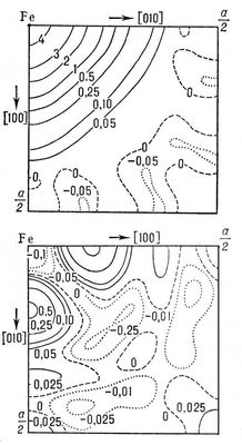 Рис. 6. Распределение спиновой плотности в элементарной ячейке железа: а — спиновая плотность 3d-электронов (полученная синтезом Фурье); атом железа находится в левом верхнем углу; цифры на кривых обозначают плотность магнитного момента в магнетонах Бора на Å3 (а — период элементарной ячейки железа); б — то же, что на а, за вычетом сферически-симметричной части спиновой плотности; в — распределение намагниченности (в кгс) в объёме элементарной ячейки железа, возникающей в результате поляризации 4s-электронов.