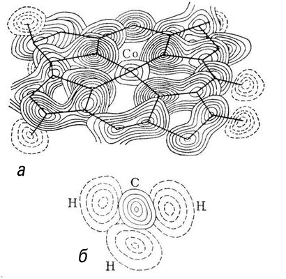 Рис. 2. а — ядерная плотность в элементарной ячейке кобальтпроизводного витамина B12 (полученная по методу синтеза Фурье). Центральный максимум, соответствующий атому Со, в связи с его малой атомной амплитудой рассеяния выражен слабо. Это позволяет более точно определять положение в ячейке лёгких атомов — азота, кислорода и водорода; б — ядерная плотность в периферийной группе CH3. Ядерная плотность для атомов водорода приведена пунктиром в соответствии с отрицательной атомной амплитудой водорода.