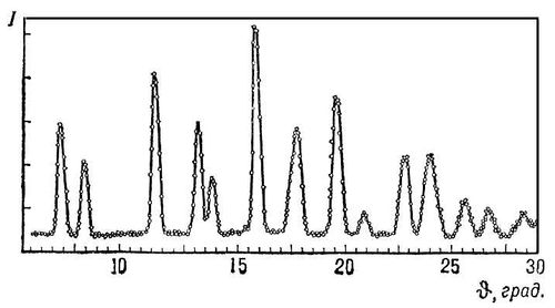 На рис. 1, б приведена нейтронограмма поликристаллического образца BiFeO3 (зависимость интенсивности рассеяния I нейтронов от угла рассеяния J). Нейтронограмма представляет собой совокупность максимумов когерентного ядерного или магнитного рассеяния (см. ниже) на фоне диффузного рассеяния.