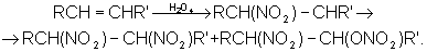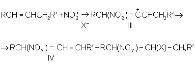 Нитрование алифатических соединений ненасыщенного ряда, например, смесью уксусного ангидрида и азотной кислоты, начинается с атаки двойной связи катионом нитрония; образующийся катион (III) стабилизируется отщеплением протона с образованием нитроолефина (IV) или присоединением аниона (X), находящегося в реакционной смеси: