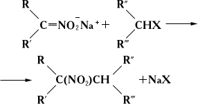 (X — атом галогена). Направление реакции зависит как от структуры соли, так и от природы алкилирующего агента. При действии на нитросоединения концентрированных кислот получаются карбоновые кислоты. Алифатические нитросоединения легко конденсируются с альдегидами и кетонами с образованием нитроспиртов, дегидратация которых приводит к нитроолефинам. Эти реакции широко используют в лабораторной практике. Нитропарафины хорошо растворяют различные органические соединения. См. также Нитрометан, Нитроформ, Тетранитрометан.