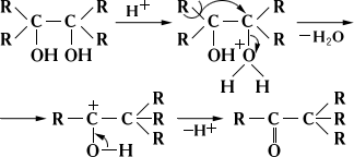 Пинаколиновая перегруппировка, образование кетонов — пинаколинов — при действии кислот (HCI, H2SO4), а также ZnCl2 на пинаконы; при этом происходит дегидратация, сопровождающаяся изменением скелета молекулы — миграцией одного из заместителей к соседнему углеродному атому. Отход гидроксильной группы и перемещение заместителя происходят синхронно (R — органический радикал):