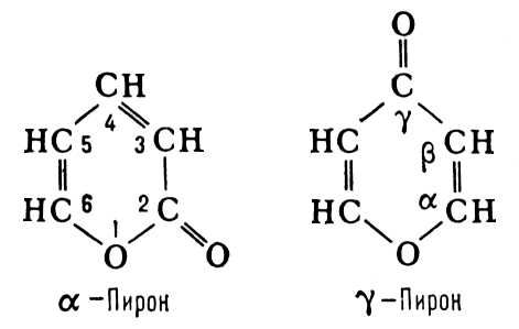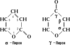 Пироны, кетопираны, гетероциклические соединения, оксопроизводные пиранов. Простейшие пироны — a-пирон (кумалин, бесцветная жидкость с запахом свежего сена, tкип 206—209 °С) и g -пирон (бесцветные кристаллы, tnл 31—32 °С).