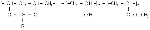 Поливинилацетали, ацетали поливинилового спирта, полимеры общей формулы I. Поливинилацетали получают обычно гидролизом поливинилацетата с последующим присоединением альдегида к образовавшемуся поливиниловому спирту. Поэтому, кроме ацетальных групп (x), поливинилацетали содержат гидроксильные (y) и ацетильные (z) группы: