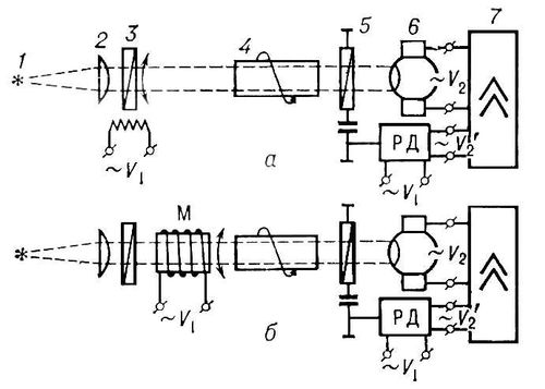 Рис. 3. Схемы автоматических поляриметров с фотоэлектрической регистрацией, основанные на модуляции света по плоскости поляризации (схема б отличается от а лишь наличием магнитооптического модулятора М, поэтому её элементы не снабжены цифровыми обозначениями). 1 — источник света; 2 — конденсор; 3 — поляризатор-модулятор света по плоскости поляризации; 4 — ячейка (кювета) с измеряемым оптически-активным веществом; 5 — анализатор; 6 — фотоприёмник; 7 — усилитель; РД — реверсивный электродвигатель. Промодулированный по интенсивности (после прохождения через анализатор) свет преобразуется фотоприёмником в переменное напряжение V2, усиливаемое до V'2 которое подаётся на одну из двух обмоток двухфазного РД, кинематически связанного с анализатором и отсчётным устройством. На другую обмотку подаётся синусоидальное (модулирующее) напряжение V1; его частота равна частоте первой гармоники модулируемого света. РД автоматически поворачивает анализатор на угол, равный измеряемому вращению. Результат измерений не зависит от изменений интенсивности света, амплитуды угловых колебаний плоскости его поляризации и коэффициента усиления в 7, что позволяет проводить измерения для сред с большим поглощением и не требует стабилизации усиления.