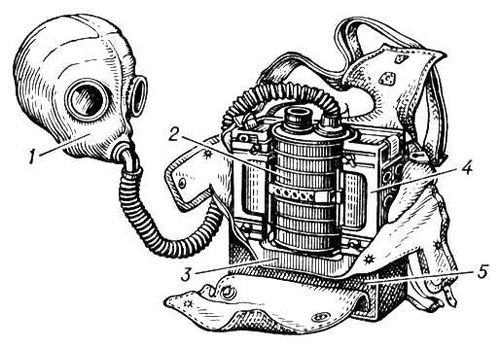 При вдохе воздух из мешка снова проходит через патрон и поступает под лицевую часть противогаза. Этот процесс повторяется при каждом цикле дыхания. Продолжительность пользования противогазом 1—3 ч; масса противогаза 4—4,5 кг. В изолирующем противогазе на основе применения в них сжатого кислорода при выдохе воздух поступает в патрон, в нём очищается от углекислого газа, далее проходит в дыхательный мешок, в который одновременно подаётся кислород из баллона. При вдохе воздух, обогащенный кислородом, поступает под лицевую часть противогаза. Продолжительность пользования противогазом 1—2 ч; масса около 9 кг.