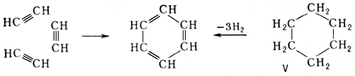 Ароматические соединения очень устойчивы; образуются из других классов соединений в жёстких условиях. Так, бензол можно получить из ацетилена при 650°C в присутствии активного угля; бензол образуется также при дегидрировании («ароматизации») циклогексана (V).