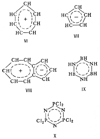 Известны небензоидные ароматические соединения, скелет которых состоит только из атомов углерода; к их числу относятся такие стабильные органические ионы, как катион тропилия (VI), анион циклопентадиенила (VII), биполярные соединения типа азуленов