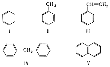 Ароматические углеводороды, органические соединения, состоящие из углерода и водорода и содержащие бензольные ядра. Простейшие и наиболее важные представители ароматических углеводородов — бензол (I) и его гомологи: метилбензол, или толуол (II), диметилбензол, или ксилол, и т. д. К ароматическим углеводородам относятся также производные бензола с ненасыщенными боковыми цепями, например стирол (III). Известно много ароматических углеводородов с несколькими бензольными ядрами в молекуле, например дифенилметан (IV), дифенил C6H5—C6H5, в котором оба бензольных ядра непосредственно связаны между собой; в нафталине (V) оба цикла имеют 2 общих атома углерода; такие углеводороды называются ароматическими углеводородами с конденсированными ядрами.