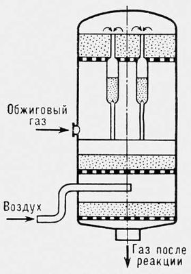 Реакторы химические с гомогенным катализатором конструктивно не отличаются от некаталитических. В ёмкостных реакторах химических с перемешиванием гетерогенный (твёрдый) катализатор может применяться в виде тонкой суспензии или, чаще, в виде зёрен, неподвижный слой которых заполняет аппарат трубчатого или колонного типа; из-за малой теплопроводности такого слоя в реакторах химических возможны значительные перепады температуры. Уменьшение размера зёрен ускоряет реакции за счёт более развитой поверхности, но вызывает снижение теплопроводности слоя и рост его гидравлического сопротивления, поэтому в практике применяют зёрна диаметром в несколько миллиметров. Схема каталитического контактного аппарата приведена на рис. 3.