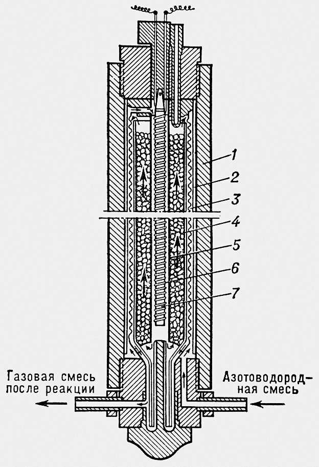 Рис. 1. Колонна для синтеза аммиака под высоким давлением: 1 — корпус колонны; 2 — изоляционная труба; 3 — теплообменная труба; 4 — катализаторное пространство; 5 — центральная труба; 6 — спираль нагрева; 7 — стальной стержень. Движение реакционной смеси указанно стрелками.