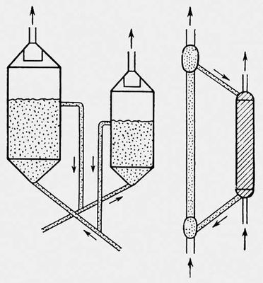 Рис. 4. Схемы установок с циркулирующим катализатором: а — реактор и регенератор с кипящим слоем; б — реактор с падающим слоем и регенератор с движущимся слоем в режиме пневмотранспортера: 1 — реактор; 2 — регенератор; 3 — фильтр или циклон; 4 — отработанный катализатор; 5 — регенерированный катализатор; 6 — сырье; 7 — регенерирующий газ.
