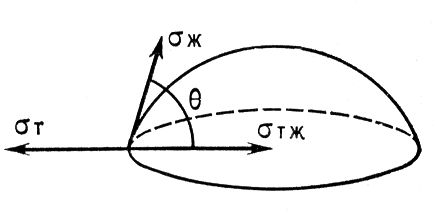 Рис. 2. Положение капли (пузырька) на твердой поверхности при различных условиях смачивания; г — газ; ж — жидкость; т — твёрдое тело.