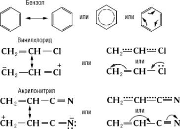 Истинное распределение электронной плотности в сопряжённых системах нельзя выразить простейшими структурными формулами. Их строение более точно передаётся наборами предельных структур (см. Мезомерия, Резонанса теория), формулами с пунктирными («полуторными») связями или с изогнутыми стрелками, указывающими направление сдвига электронов, например: