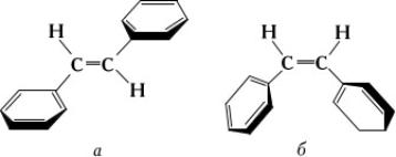 Для проявления сопряжения связей необходимо, чтобы участвующие в нём электронные системы находились в одной плоскости. Если структура молекулы не допускает этого, то говорят о пространственных препятствиях сопряжению. Так, у транс-стильбена (а), по данным УФ-спектров, обнаруживается более сильное сопряжение, чем у цис-стильбена (б), у которого бензольные ядра не могут разместиться в одной плоскости с двойной связью: