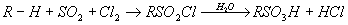 В алифатические соединения сульфогруппу вводят обычно косвенным способом, например обменом галогена в галогенопроизводных (1) или действием на углеводороды сернистого ангидрида и хлора при облучении ультрафиолетовым светом (сульфохлорирование) с последующим гидролизом (2):