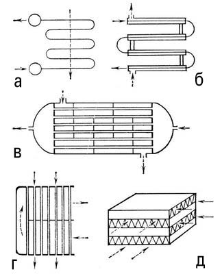 Конструкции рекуперативных теплообменников: а — змеевиковый; б — типа «труба в трубе»; в — кожухотрубный; г — трубчатый воздухонагреватель; д — пластинчатый.