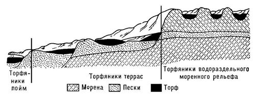 Образование торфа. Торф — предшественник генетического ряда углей (по мнению ряда учёных). Место образования торфа — торфяные болота (см. Болото), встречающиеся как в долинах рек (поймы, террасы), так и на водоразделах (рис. 1).