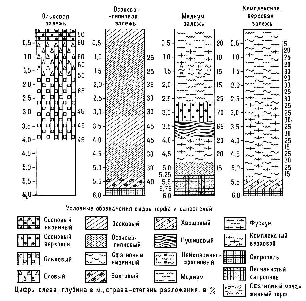 Классификация торфа. В соответствии с составом исходного растительного материала, условиями образования торфа и его физико-химическими свойствами торф относят к одному из 3 типов: верховому, переходному и низинному. Каждый тип по содержанию в торфе древесных остатков подразделяется на три подтипа: лесной, лесотопяной и топяной. Торф разных подтипов отличается по степени разложения. Торф лесного подтипа имеет высокую степень разложения (иногда до 80%), у топяного торфа — минимальная степень разложения; лесотопяной торф занимает промежуточное положение. Подтипы торфа делятся на группы, состоящие из 4—8 видов (табл. 1). Вид — первичная таксономическая единица классификации торфов. Он отражает исходную растительную группировку и первичные условия образования торфа, характеризуется определённым сочетанием доминирующих остатков отдельных видов растений (а также характерных остатков). Пластообразующими видами торфа называют совокупность нескольких первичных видов торфа, мало отличающихся друг от друга по своим свойствам и образующих большие горизонтально залегающие однородные слои. Отложения пластообразующих видов той или иной протяжённости и мощности (толщины), закономерно сменяющиеся в определённой последовательности, образуют торфяную залежь. На характер строения залежи определённой климатической зоны влияют геоморфологические, геологические, гидрогеологические, гидрологические условия каждого конкретного участка болота. В зависимости от сочетания отдельных видов торфов по глубине торфяной залежи последние подразделяются на типы. В промышленной классификации торфяных залежей выделяются 4 типа: низинный, переходный, верховой и смешанный. Первичная единица классификации — вид торфяной залежи (рис. 2). В Европейской части СССР выделяются 25 основных видов торфяных залежей, в Западной Сибири — 32.