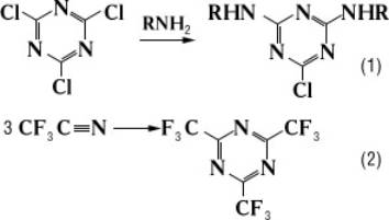 Триазины — сильные основания, дают соли с кислотами. Наибольшее практическое значение имеют замещенные 1, 3, 5-триазинов, применяемые как гербициды (например, атразин, десметрин, прометрин), красители, для производства пластмасс, каучуков и др. Эти замещенные триазинов получают, например, из цианурхлорида (1) или тримеризацией нитрилов карбоновых кислот (2):