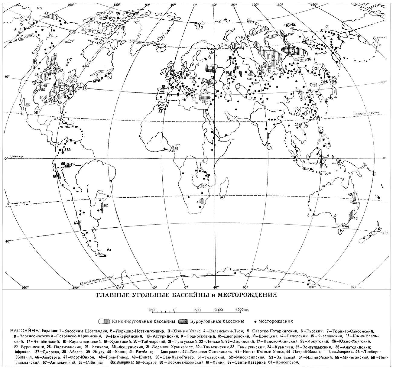 Углеобразование является одним из региональных геологических процессов, проявившихся на территории всех континентов (рис. 3). Площади непрерывного распространения угленосных формаций (см. Формация геологическая) колеблются от нескольких до сотен тыс. км; мощности — от десятков м до 20 км, число заключённых в них пластов угля — от единиц до нескольких сотен. Согласно современным представлениям, все основные черты угленосных формаций — их мощность, пространственная изменчивость состава и строения, взаимоотношение с вмещающими породами, количественная и качественная характеристика угленосности, метаморфизм углей, тектоника и др.— определяются характером и интенсивностью колебательных движений земной коры, в тесной взаимосвязи с историей структурного развития и палеогеографией. Так, для угленосных формаций, приуроченных к краевым прогибам, унаследованным и наложенным крупным впадинам на складчатом основании (см. Тектонические прогибы), характерны большая мощность формаций; зональность их тектонического строения (от сильно дислоцированных структур по границе с орогенными областями к спокойным в центральной и приплатформенной частях бассейна), многопластовость, горизонтальная и вертикальная зональность в проявлении регионального метаморфизма углей, широкий диапазон их марочного состава (от бурых до антрацитов). В СССР с этими формациями связаны бассейны, обеспечивающие сырьём коксохимическую промышленность: Донецкий, Кузнецкий, Карагандинский и Печорский.