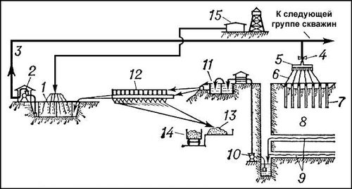 Схема подземного бактериального выщелачивания медной руды: 1 — прудок для выращивания и регенерации бактерий; 2 — насосная для перекачки бактериального раствора к руде; 3 — трубопровод; 4 — задвижка; 5 — коллектор; 6 — полиэтиленовый шланг; 7 — скважина для орошения рудного тела бактериальным раствором; 8 — орошаемый участок рудной залежи; 9 — горизонтальные горные выработки для сбора бактериального раствора, обогащенного медью; 10 — насос; 11 — отстойник для насыщенных медью растворов; 12 — цементационная ванна для получения порошкообразной меди; 13 — сушка цементной меди; 14 — транспортировка меди потребителям; 15 — компрессорная для обогащения бактериального раствора кислородом.