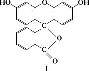 Флуоресцеин, диоксифлуоран, жёлтые кристаллы, плохо растворимые в воде, лучше – в спирте и водных щелочах, tпл 314–316 °С (с разложением); в водных растворах существует в виде смеси (1: 1) бензоидной (1) и хиноидной форм и обладает сильной жёлто-зелёной флуоресценцией (отсюда и название).