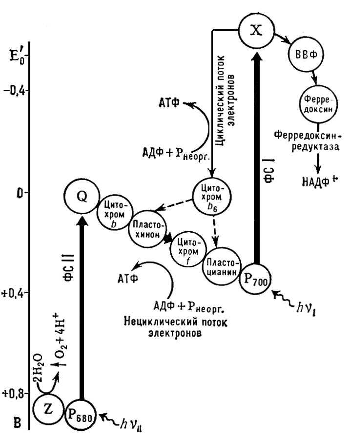 — окислительно-восстановительный потенциал при pH 7 (в вольтах), Z — донор электронов для ФС II, P680 — энергетическая ловушка и реакционный центр ФС II (светособирающая антенна этого центра включает молекулу хлорофилла а, хлорофилла b, ксантофиллы), Q — первичный акцептор электронов в ФС II, АДФ — аденозиндифосфат, Pнеорг. — неорганический фосфат, АТФ — аденозинтрифосфат, Р700 — энергетическая ловушка и реакционный центр ФС I (светособирающая антенна этого центра включает молекулу хлорофила а, хлорофилла b, каротин), ВВФ — вещество, восстанавливающее ферредоксин.