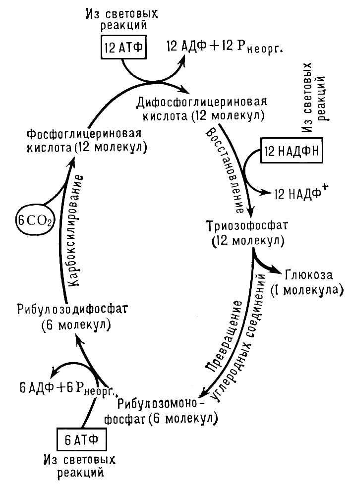 Ассимиляция углекислоты. Ассимиляция CO2 происходит в процессе темновых реакций. Восстановлению при фотосинтезе подвергается не свободная молекула CO2, а предварительно включенная в состав определённого органического соединения. В большинстве случаев акцептором CO2 служит двукратно фосфорилированный пятиуглеродный сахар рибулозодифосфат (РДФ). Присоединяя CO2, РДФ распадается на 2 молекулы фосфоглицериновой кислоты (ФГК). Углерод CO2, включенный в молекулу ФГК, и является конечным звеном цепи, к которому направляются электроны, мобилизуемые хлорофиллом. Присоединив электрон, ФГК превращается в восстановленное соединение – фосфоглицериновый альдегид (в этом процессе участвуют АТФ и НАДФ-Н), который может рассматриваться как первый стабильный углеводный продукт фотосинтеза, содержащий углерод уже в восстановленной (органической) форме. Дальнейшие превращения происходят в пентозофосфатном цикле и завершаются, с одной стороны, образованием РДФ, т. е. происходит регенерация первичного акцептора CO2 (что делает цикл при наличии света и CO2 непрерывно действующим), а с др. стороны – образованием продуктов фотосинтеза – углеводов.