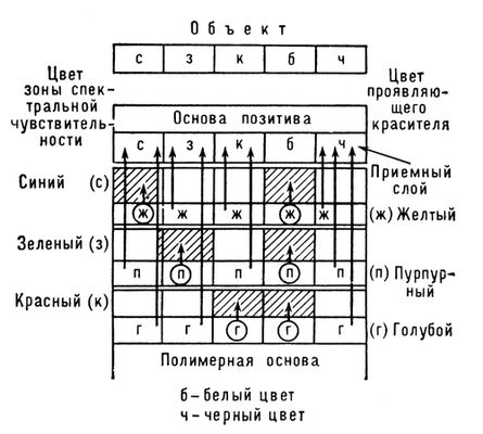 Рис. 2. Схема диффузионного цветного фотографического процесса (с обращением). Штриховкой обозначены черно-белые цветоделённые негативные изображения, состоящие из металлического серебра.