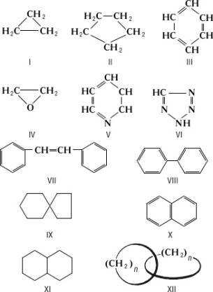 Наиболее распространены (вследствие лёгкости образования и отсутствия напряжения в циклах) 5- и 6-звенные кольца. В зависимости от природы атомов, образующих циклы, циклические соединения подразделяют на изоциклические, или карбоциклические соединения, циклы которых состоят только из атомов углерода, например алициклические соединения — циклопропан (1) и циклопентан (II), ароматические соединения — бензол (III); гетероциклические соединения, в циклах которых, кроме углерода, имеется также один или несколько атомов др. элементов, т. н. гетероатомов, главным образом кислорода, азота, серы, например этилена окись (IV), пиридин (V), тетразол (VI). В многоядерных циклических соединениях кольца могут быть изолированными друг от друга, как, например, в стильбене (VII), связанными одной простой связью, как в дифениле (VIII), иметь один общий атом [(IX), см. Спираны] или два (т. н. конденсированные циклические соединения), например нафталин (X), декалин (XI). Особый случай циклических соединений — катенаны (XII), молекулы которых построены по принципу обычной цепи (звено в звене). Примером неорганических циклических соединений могут служить некоторые соединения бора, например боразол, фосфора, например фосфонитрилхлориды, кремния — циклосплоксаны. См. также Органическая химия.